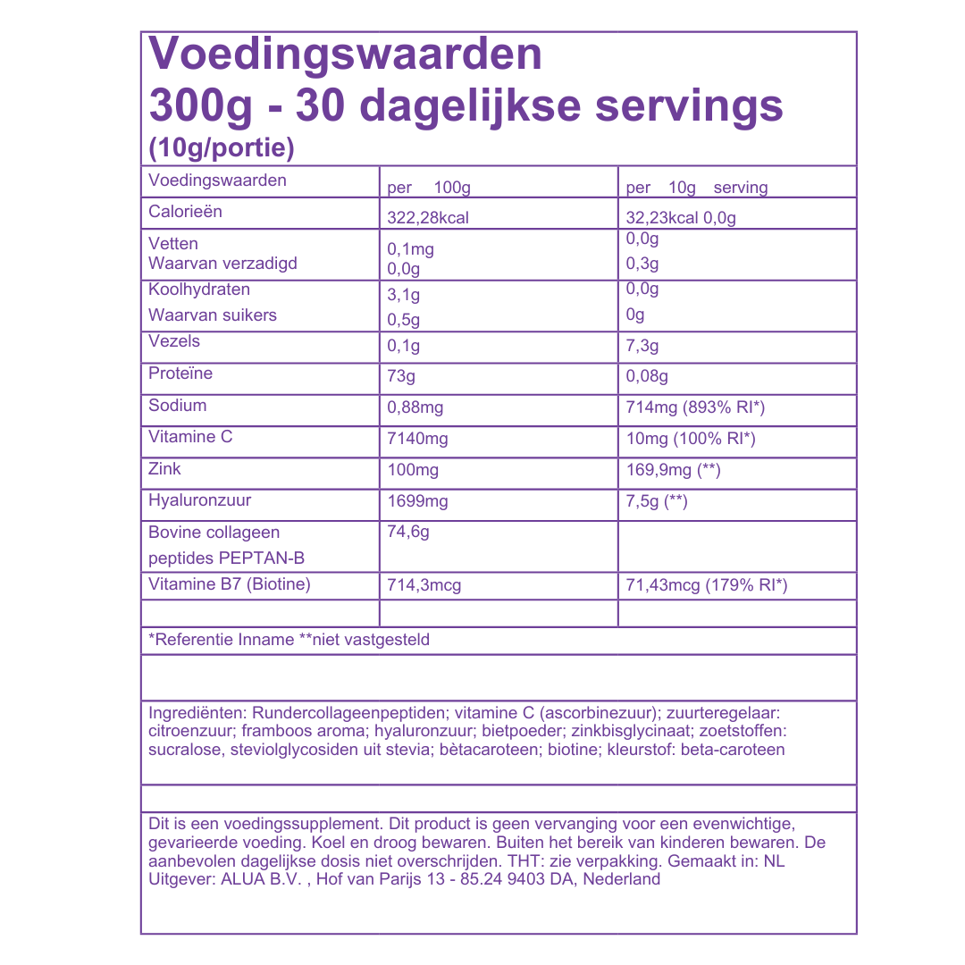 Alua besteht zu 100 % aus hydrolysiertem Kollagen. Hydrolysiertes Kollagen ist Kollagen, bei dem die Fasern in Peptide (sehr kleine Partikel) aufgespalten wurden. Dies gewährleistet eine bessere und schnellere Aufnahme durch den Körper.