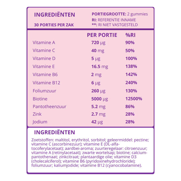 Biotine (Vitamine B8): Draagt bij aan het behoud van normaal haar, een gezonde huid en helpt energie vrij te maken uit voeding.