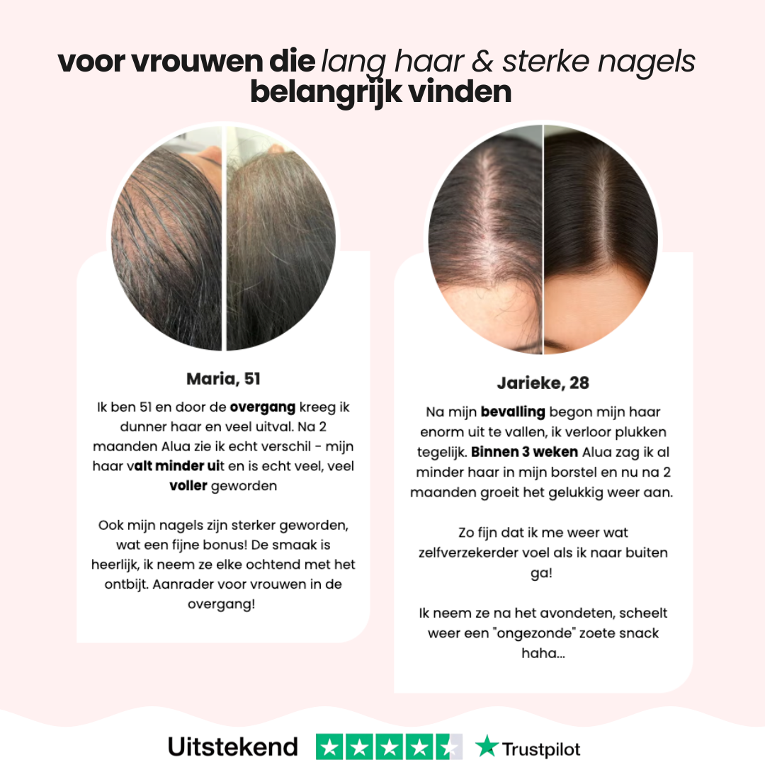 Ich bin 51 und hatte aufgrund der Wechseljahre mit dünner werdendem Haar und starkem Haarausfall zu kämpfen. Nach zwei Monaten mit Alua sehe ich wirklich einen Unterschied – mein Haar fällt weniger aus und ist viel voller geworden.